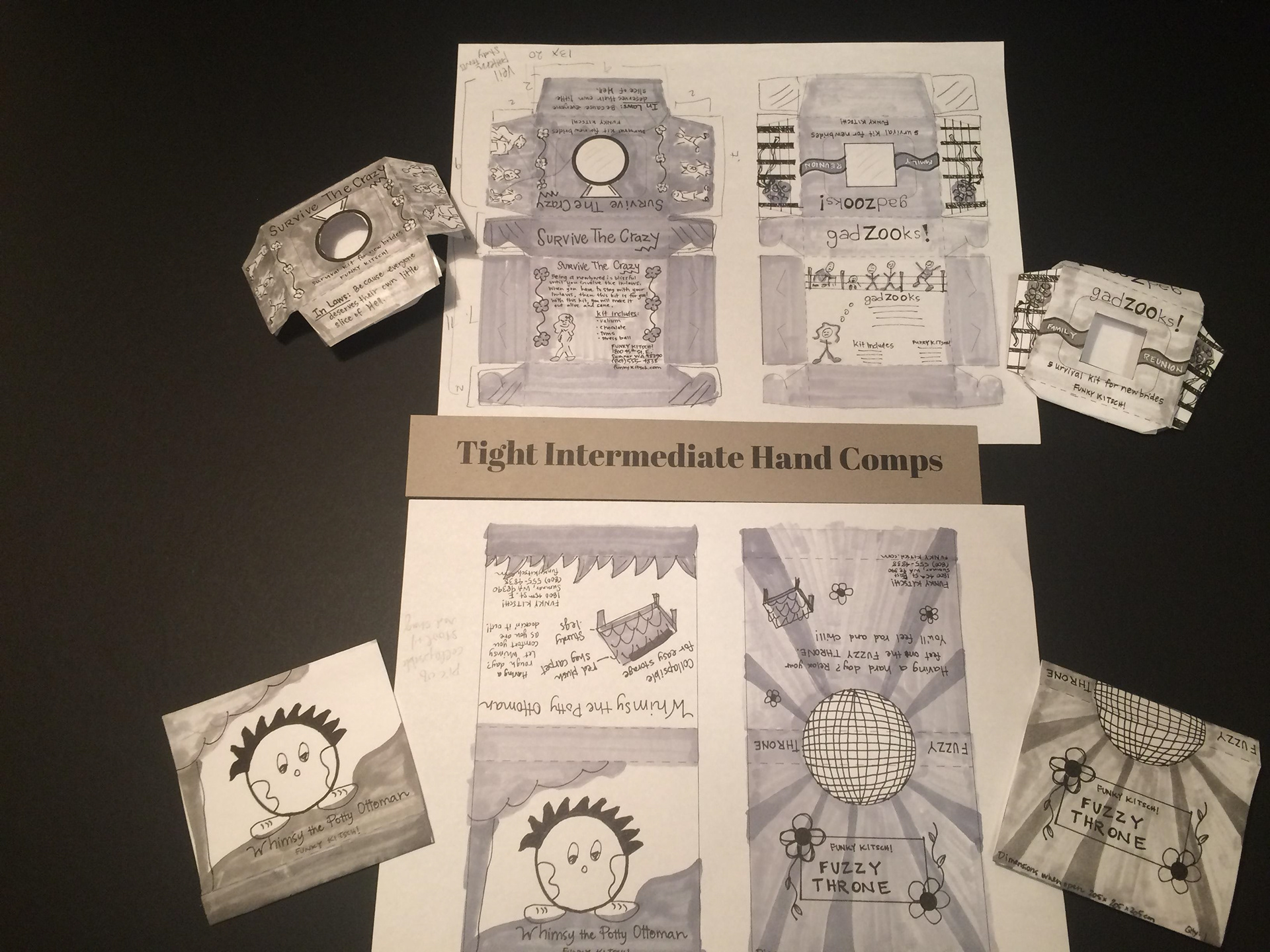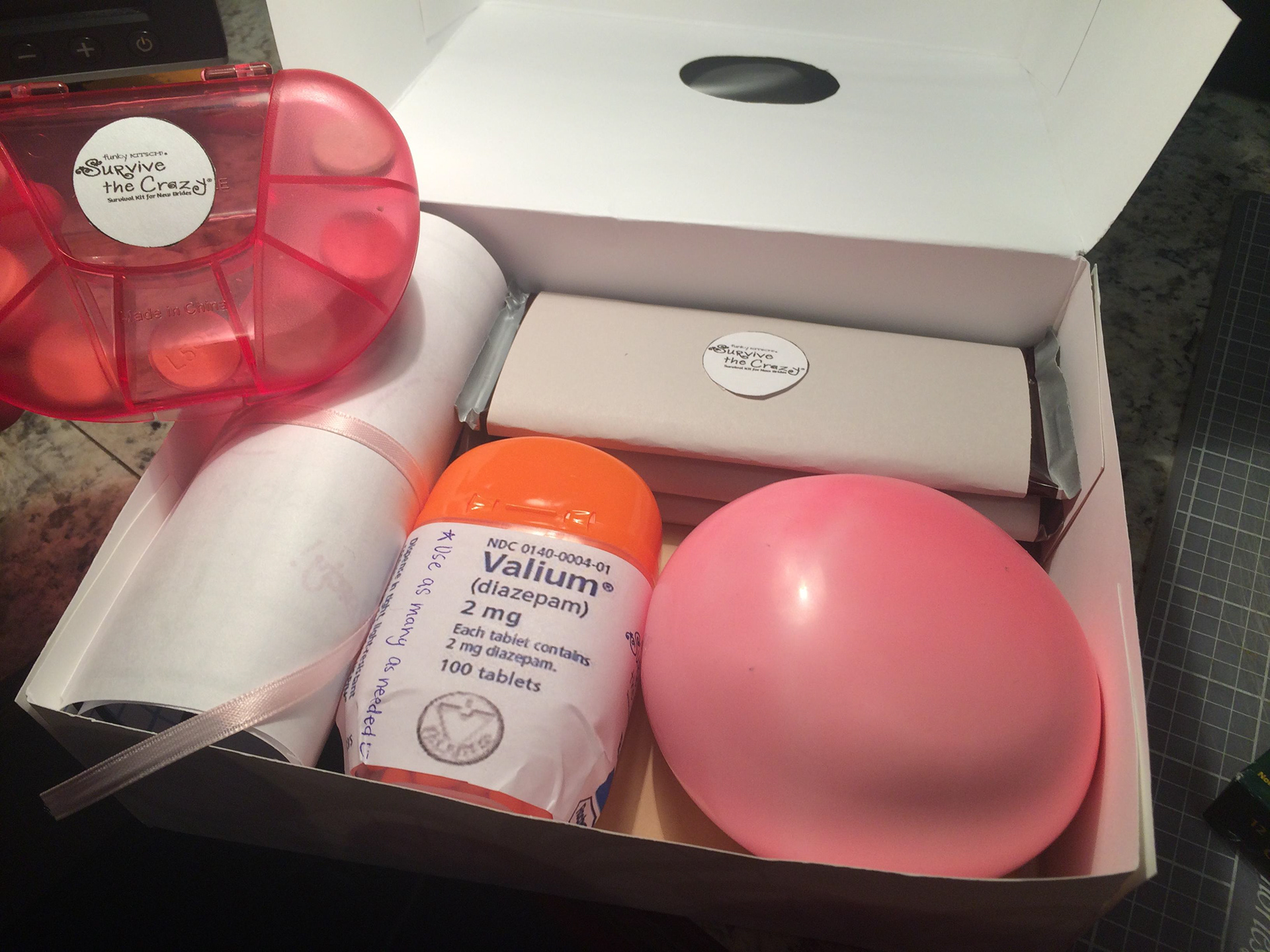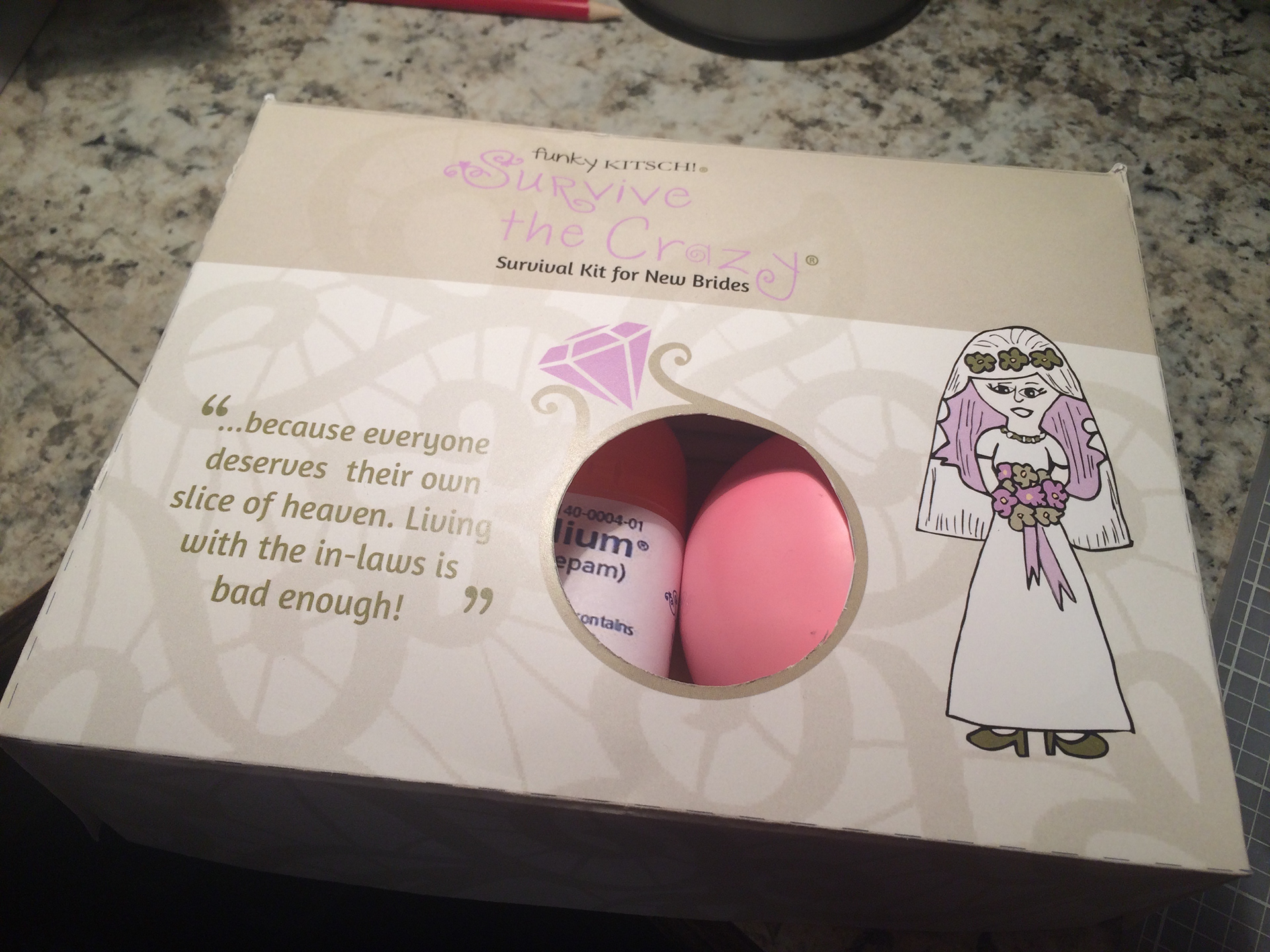 As many of us know how stressful family reunions and weddings can be. I wanted to design something that help future brides and those needing something to help them survive those hard times in their life. I designed the title to look frilly and yet crazy as it is found in cartoons. I added a stress ball for those moments that you can’t leave a tense situation. I added valium for added stress relief and anxiety. I also added chocolate for every female who needs a break. Then I also added Tums for upset stomachs when everything is crashing. I added a “Little Solution Book for New Brides” and it is purposely blank because no one has yet figured out out to make all this stress go away. And of course you have to have a dating black book to keep track of all guys you date and can list the pros and cons for each one.
